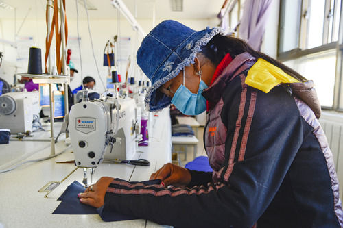 搬遷群眾在西藏阿里地區(qū)噶爾縣獅泉河鎮(zhèn)康樂新居服裝加工廠縫制衣服(10月17日攝)。新華社記者 田金文 攝