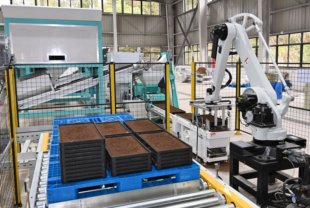 在浙江省東陽市皇野生態(tài)農(nóng)業(yè)有限公司現(xiàn)代農(nóng)事服務(wù)中心,全自動(dòng)智能水稻育秧生產(chǎn)線在制作秧盤(2025年3月13日攝)。新華社發(fā)(包康軒 攝)