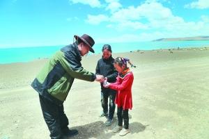 余風(fēng)每次下鄉(xiāng)看到藏族孩子,總會分給他們糖果、餅干等零食。圖為余風(fēng)在雙湖縣下鄉(xiāng)時(shí)與藏族孩子在一起。