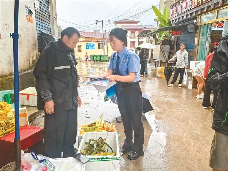 圖為干警向商戶發(fā)放宣傳資料和宣傳品。記者 王珊 攝