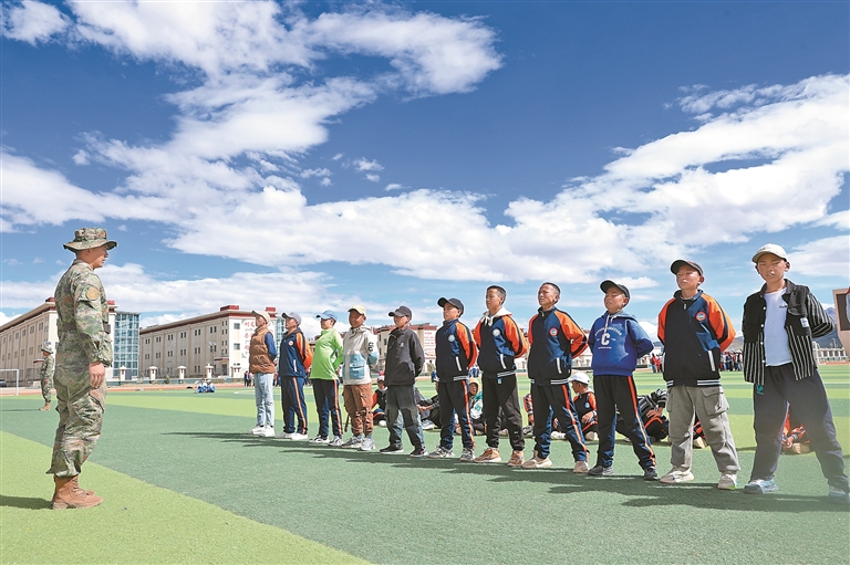官兵幫帶駐地中學(xué)新生軍訓(xùn)。遲浩鵬 攝