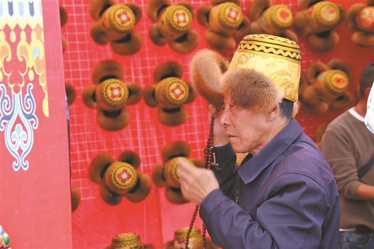 圖為觀展市民在展會上試戴扎囊縣出產(chǎn)的特色民族服飾“次仁金果”藏帽。