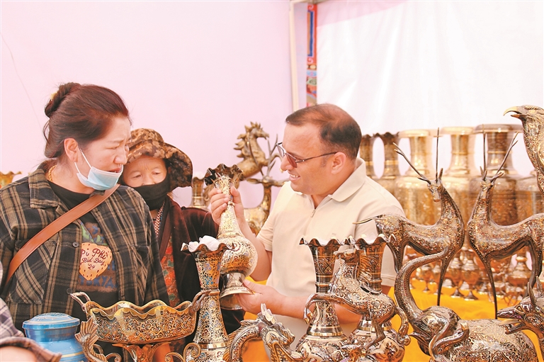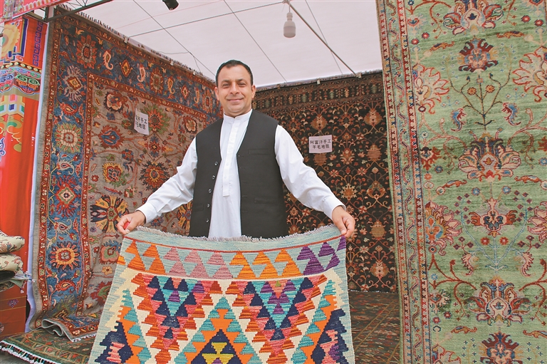 在眾多商戶里,來自巴基斯坦的商戶Asif的攤位前,滿滿的異域風(fēng)情撲面而來。他一邊舉著色彩斑斕的手工羊毛毯向顧客介紹,一邊向記者興奮地說道:“我是第一次來山南,這里的人們都很熱情,對我們的手工羊毛毯特別感興趣。能把家鄉(xiāng)的工藝帶到這兒,我非常開心!”
