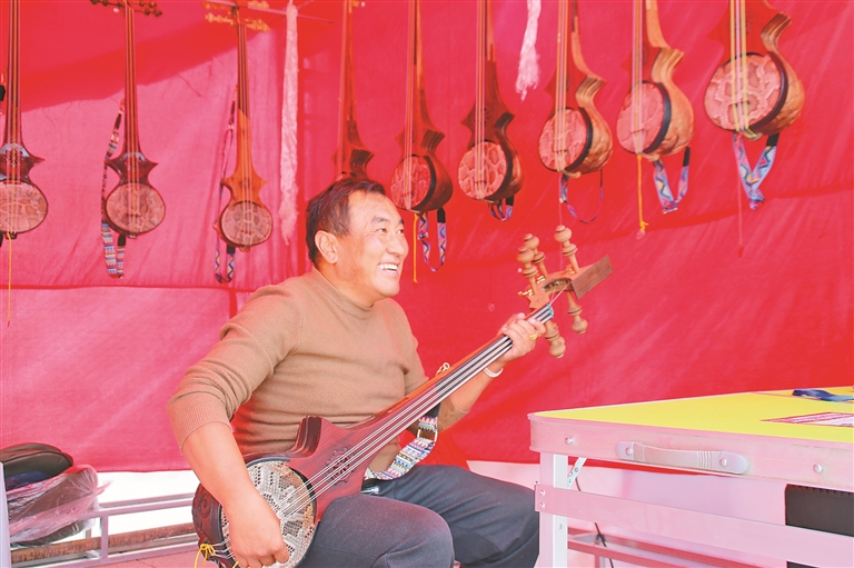 圖為山南市曲松縣參展商在展會現(xiàn)場為觀展群眾彈奏扎念琴。