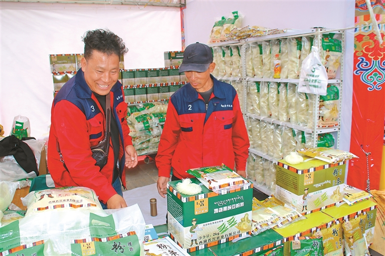 圖為來自山南市乃東區(qū)昌珠鎮(zhèn)克松社區(qū)的參展商在展位上銷售雅礱豌豆粉條。