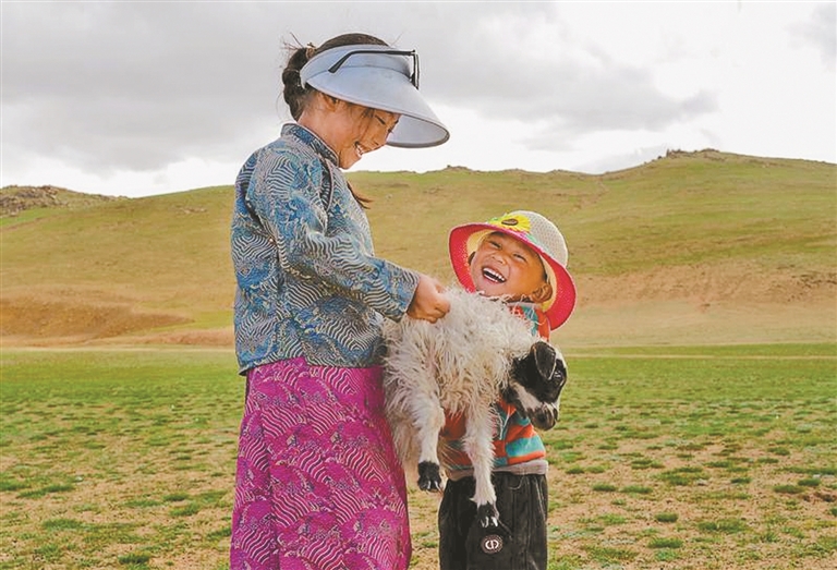 羌塘草原上,牧民和孩子與羊羔親密互動(dòng)。記者 丹增群培 攝