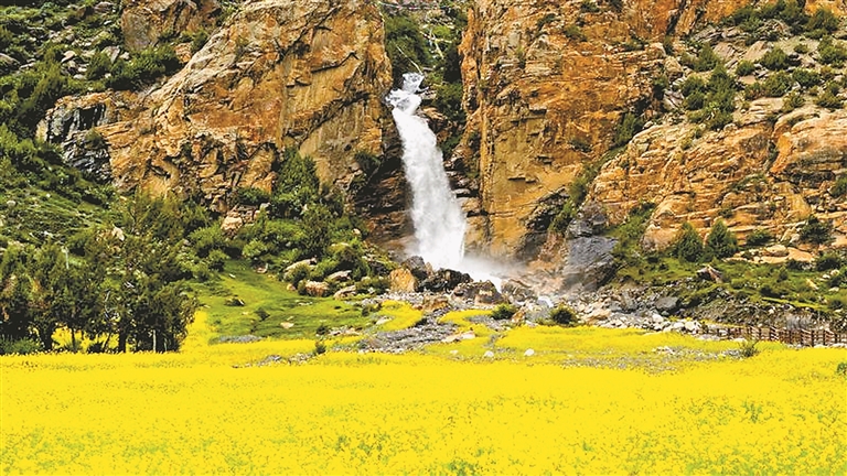 昌都市邊壩縣三色湖畔飛流的瀑布。記者 丹增群培 攝