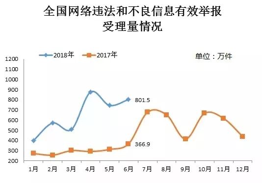 6月份,全國(guó)各級(jí)網(wǎng)絡(luò)舉報(bào)部門(mén)受理有效舉報(bào)801.5萬(wàn)件,環(huán)比、同比分別增長(zhǎng)7.7%和1.2倍。其中,中國(guó)互聯(lián)網(wǎng)違法和不良信息舉報(bào)中心受理6.7萬(wàn)件,環(huán)比下降1.6%,同比增長(zhǎng)2.3%;各地網(wǎng)信辦舉報(bào)部門(mén)受理316.3萬(wàn)件,環(huán)比下降34.0%,同比增長(zhǎng)1.1倍;全國(guó)主要網(wǎng)站受理478.5萬(wàn)件,環(huán)比、同比分別增長(zhǎng)85.3%和1.3倍。