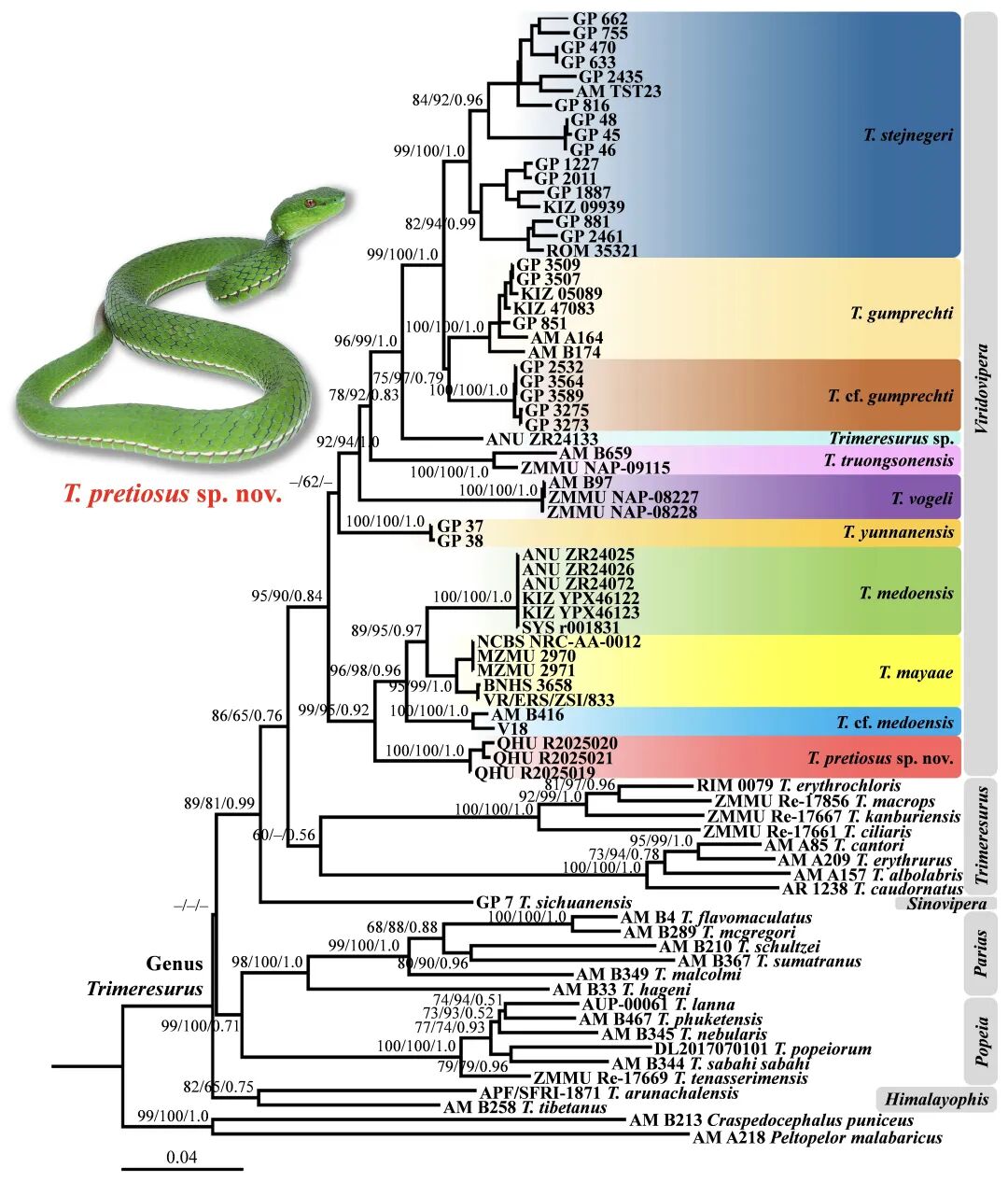 據(jù)自治區(qū)高原生物研究所有關(guān)負(fù)責(zé)人介紹,該新物種為綠蝮亞屬目前已知的全球分布最西端成員,其棲息地位于我國與不丹、印度邊境,對于研究喜馬拉雅地區(qū)蛇類演化和生物地理格局具有重要價(jià)值。至此,全球已知竹葉青蛇屬物種數(shù)量增至56種,其中我國分布物種達(dá)15種。