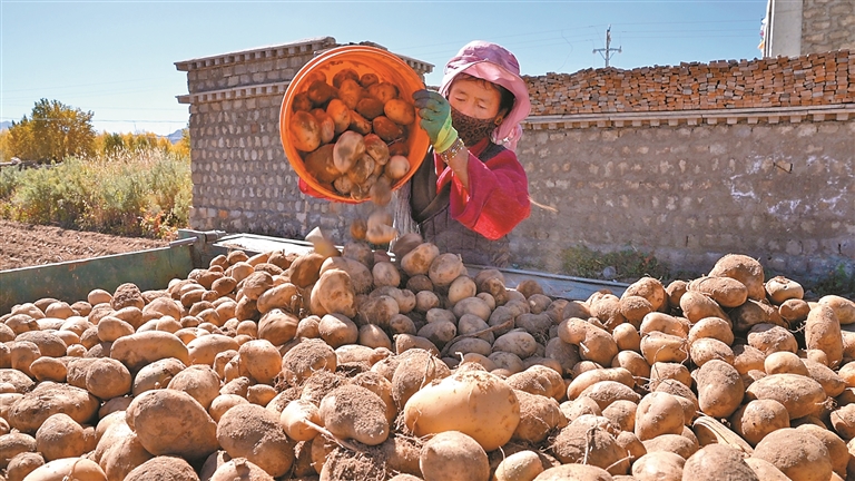 南木林縣艾瑪鄉(xiāng)群眾正在將收獲的土豆集中裝車。