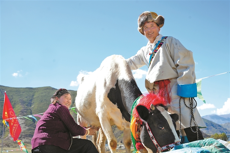薩迦縣慶祝2025年中國(guó)農(nóng)民豐收節(jié)系列活動(dòng)中的奶牛擠奶比賽現(xiàn)場(chǎng)。