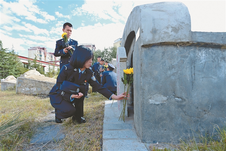 西藏警官高等??茖W(xué)校學(xué)生在拉薩烈士陵園向先烈敬獻(xiàn)鮮花。記者 唐斌 攝
