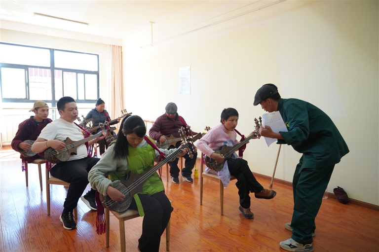 更讓次仁羅吉驚喜的是,托養(yǎng)中心為她打開了技能與興趣的大門。她本就對縫紉有些接觸,在這里更是系統(tǒng)學會了編織,進一步提升了縫紉技能。她的雙手不僅能創(chuàng)造實用物件,還能奏響傳統(tǒng)的旋律。今年,在工作人員日復一日的耐心指導下,她從零開始學習扎木念,歷經(jīng)多日練習,終于能完整彈奏一段曲子。如今,她的手指在琴弦上靈動跳躍,每一個音符都成了她打破局限、擁抱自信的見證。