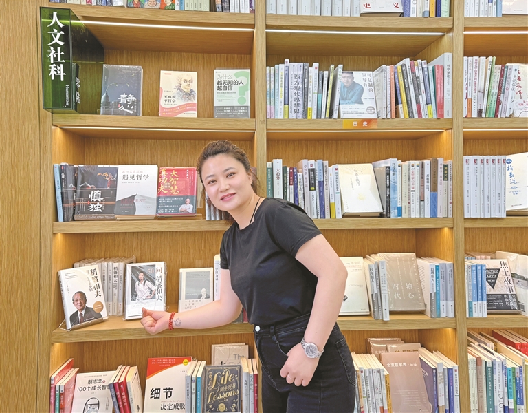 棗兒在中央團校的書店內(nèi)與自己的作品合影。