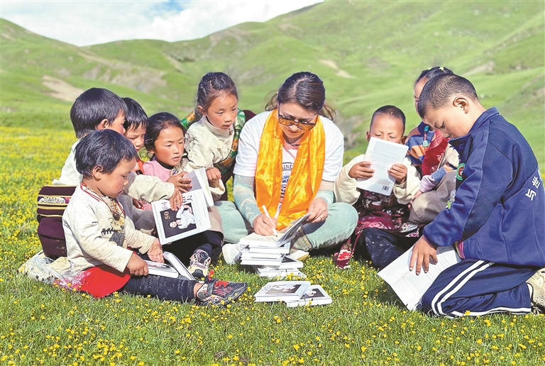 棗兒在藏北草原上為書友簽名留念 ,引來了一群草原上的孩子圍觀。
