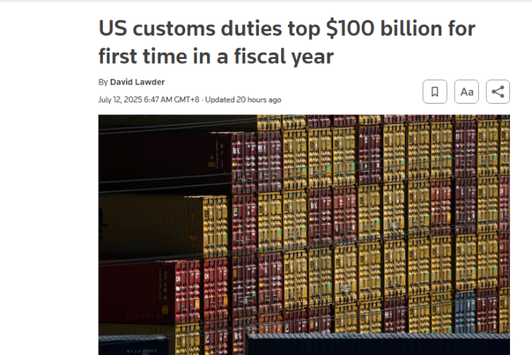 數(shù)據(jù)顯示,6月美國(guó)海關(guān)關(guān)稅總額高達(dá)約270億美元,較去年同期暴增301%,這使得美國(guó)單一財(cái)年內(nèi)關(guān)稅收入累積金額首次突破1000億美元。