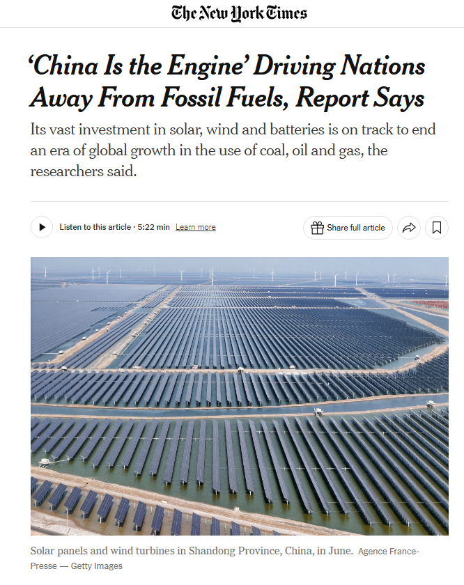 《紐約時(shí)報(bào)》網(wǎng)站近日刊登的一篇文章指出,自工業(yè)革命以來,全球經(jīng)濟(jì)需要越來越多的化石燃料——煤炭、石油和天然氣來推動(dòng)增長。不過,一份新報(bào)告指出,中國在向全球銷售電池、太陽能電池板和風(fēng)力渦輪機(jī)等方面的積極努力,正在為終結(jié)這一化石燃料時(shí)代創(chuàng)造條件。