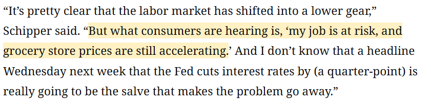美國(guó)圣托馬斯大學(xué)副教授泰勒·施普爾?。═yler Schipper)認(rèn)為?。簩?duì)普通消費(fèi)者來說,耳邊最真切的聲音是“我的工作隨時(shí)可能保不住”,是“超市里的食品雜貨價(jià)格還在一個(gè)勁往上漲”。所以我實(shí)在不確定,下周“美聯(lián)儲(chǔ)降息”的頭條新聞,真能成為化解這些現(xiàn)實(shí)困境的良藥嗎?