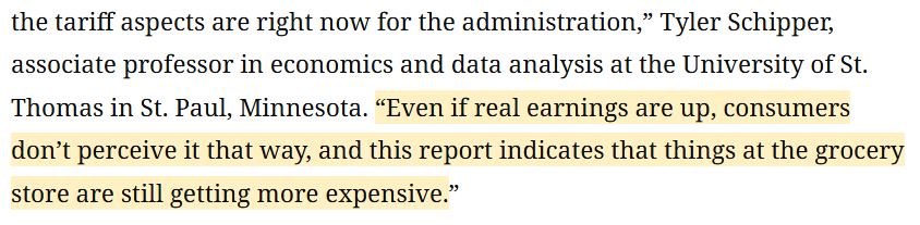 經(jīng)濟(jì)學(xué)家泰勒?施皮珀(Tyler Schipper)直言:“老百姓感受不到工資上漲,他們只知道超市商品的價(jià)格越來越貴?!?/p>