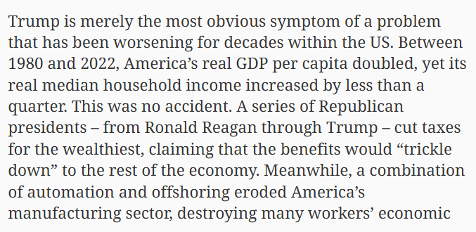文章進一步分析,特朗普現(xiàn)象并非偶然,而是美國長期積累的問題所致。1980年至2022年間,美國人均GDP翻了一番,但實際家庭收入中位數(shù)僅增長不足25%。文章稱,歷任共和黨政府一再為富人減稅,宣稱“涓滴效應”會惠及大眾,但現(xiàn)實卻是產(chǎn)業(yè)空心化、制造業(yè)崗位流失,摧毀眾多工人的經(jīng)濟保障。