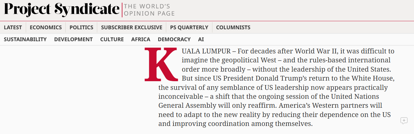 在第80屆聯(lián)合國大會召開之際,世界報業(yè)辛迪加(Project Syndicate)發(fā)表評論文章指出,特朗普重返白宮,使美國的國際領導地位幾近消失。西方必須適應“沒有美國領導”的現(xiàn)實局面。