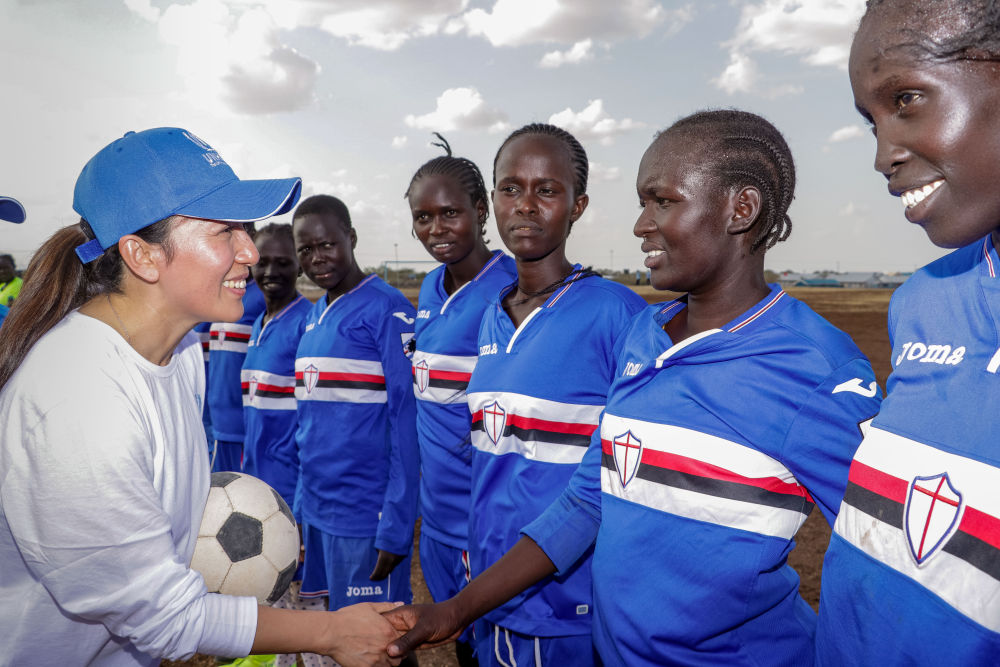 第二張照片里,在肯尼亞西北部卡庫(kù)馬難民營(yíng)一片簡(jiǎn)易球場(chǎng)上,聯(lián)合國(guó)難民署親善大使楊揚(yáng)正同當(dāng)?shù)匾恢幼闱蜿?duì)的隊(duì)員握手、交流。來(lái)自南蘇丹的瑪格麗特就在其中。