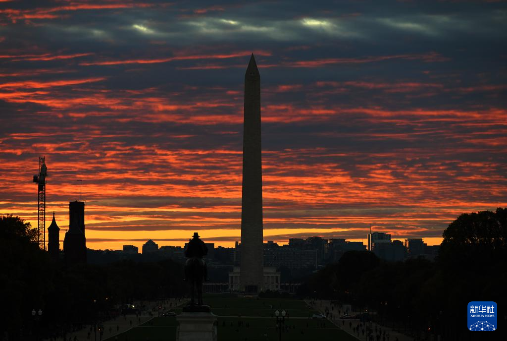 這是10月15日拍攝的日落時分的美國華盛頓紀(jì)念碑。新華社記者 李睿 攝
