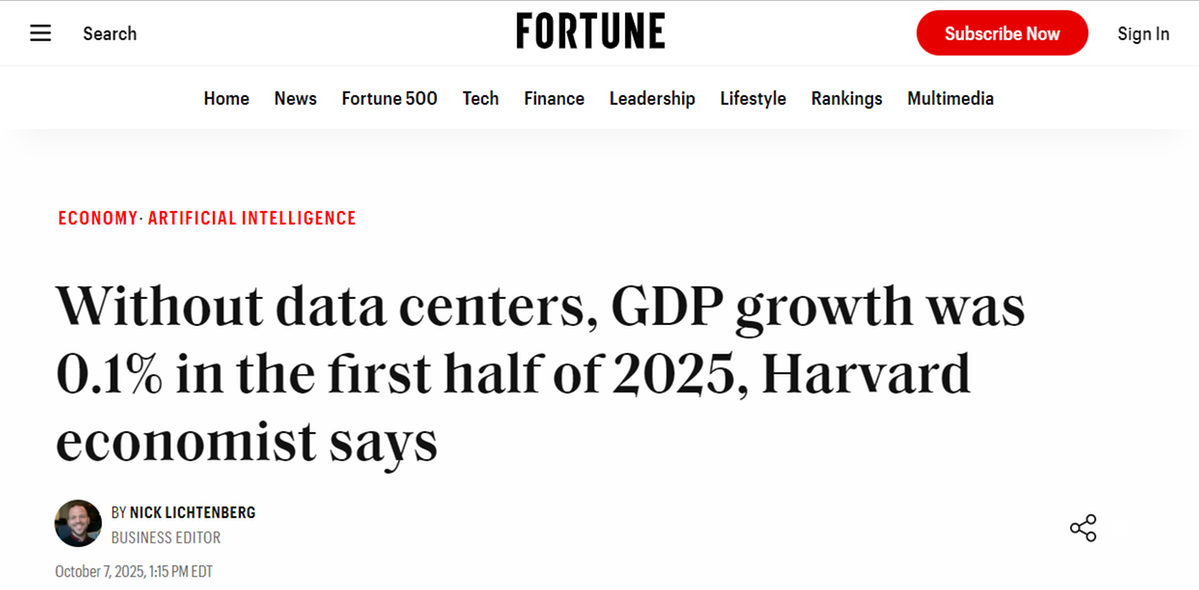 2025年上半年,美國GDP增長幾乎全部依賴數(shù)據(jù)中心和AI投資,其中AI投資占比近92%。哈佛大學(xué)經(jīng)濟(jì)學(xué)家杰森·弗曼指出,若剔除這一領(lǐng)域,其余產(chǎn)業(yè)合計(jì)成長率僅0.1%,幾乎陷入停滯。