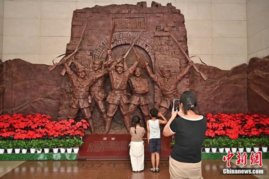 民眾參觀平型關大捷紀念館,背景資料為抗日民族統(tǒng)一戰(zhàn)線正式形成。中新社記者 韋亮 攝