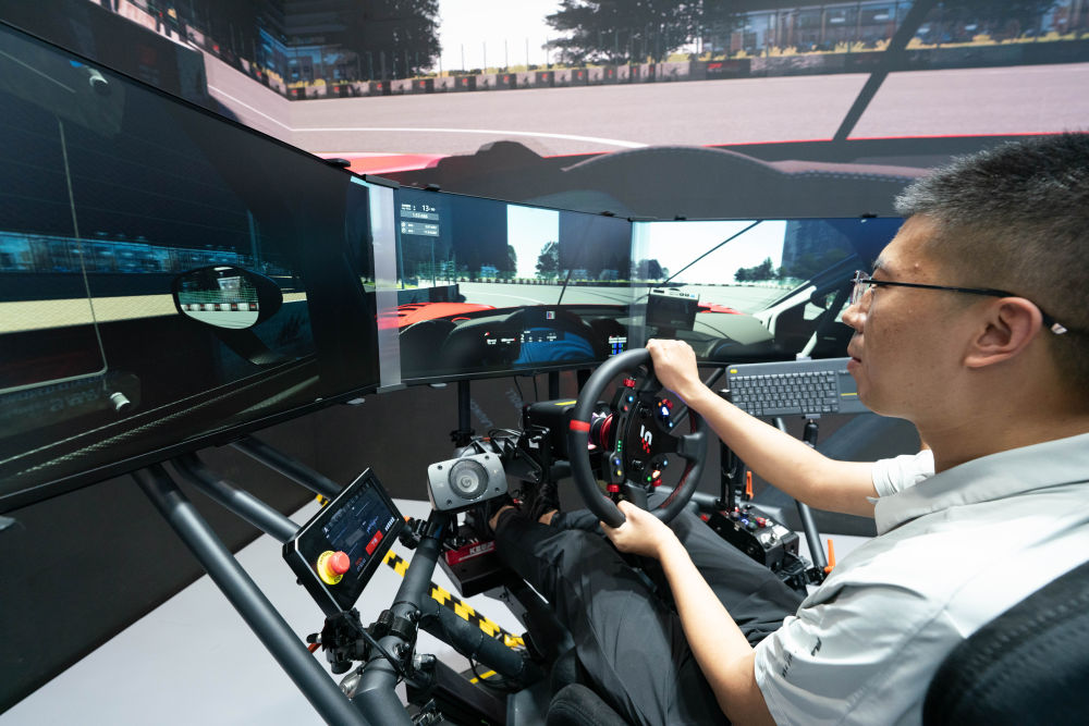 ↑ 9月11日,參觀者在體驗(yàn)六自由度賽車模擬器。