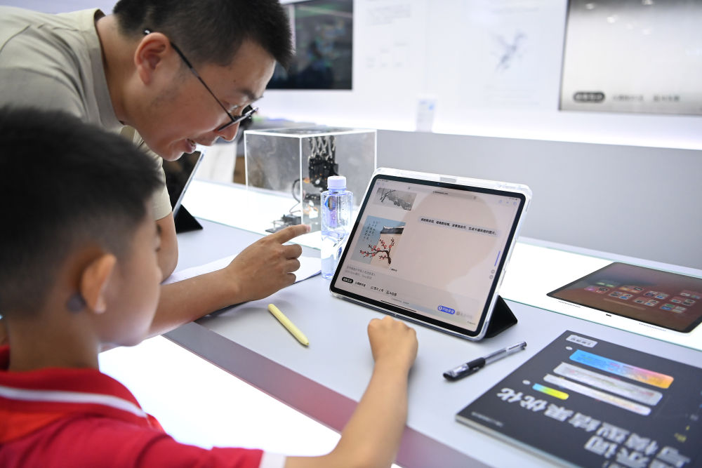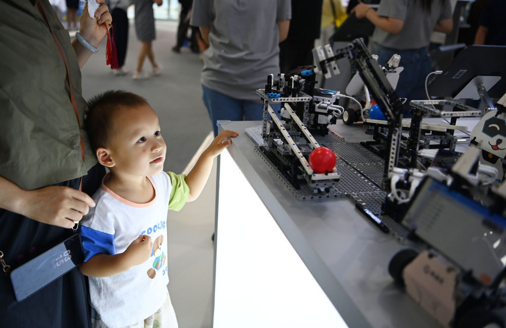↑ 9月11日,在服貿(mào)會(huì)教育服務(wù)專題展區(qū),一名小朋友在猿編程展臺(tái)觀看最新AI教育產(chǎn)品。