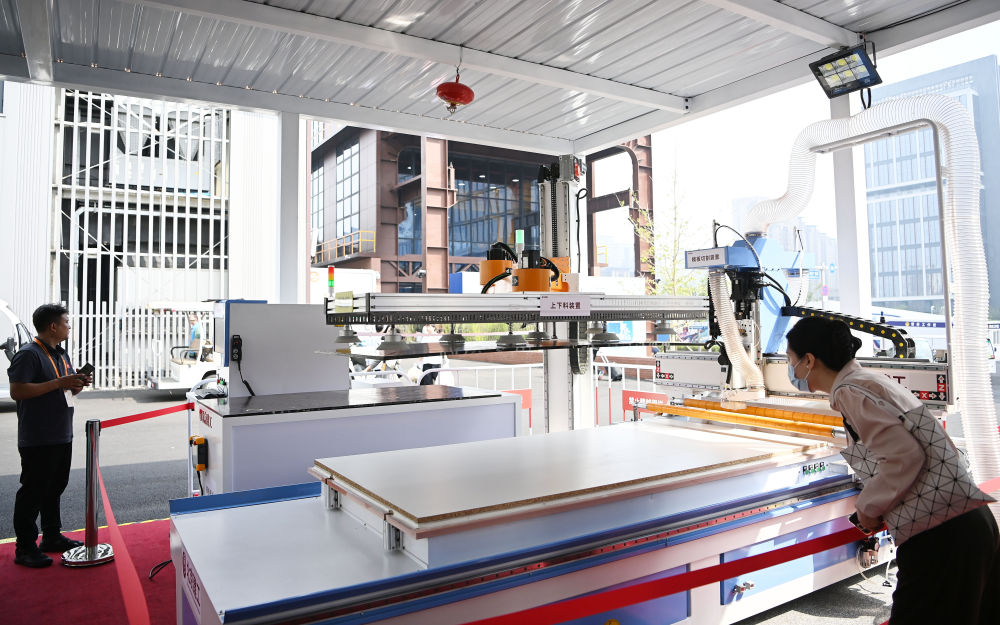 ↑ 9月11日,在服貿(mào)會(huì)工程咨詢與建筑服務(wù)專題展區(qū),參觀者(右)在北京建工展臺(tái)參觀智能模板無(wú)人工廠。