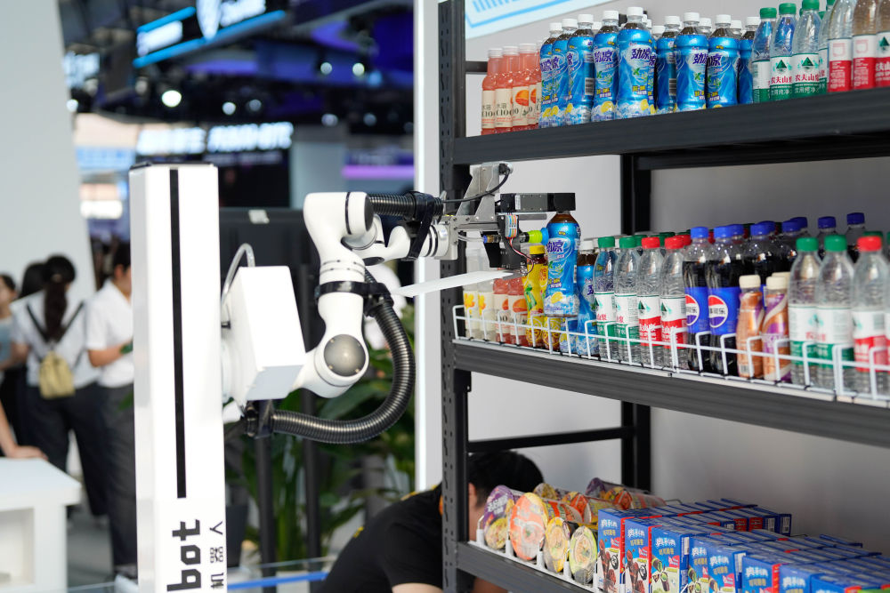 ↑ 9月11日,機(jī)器人在從貨架上取送貨物。