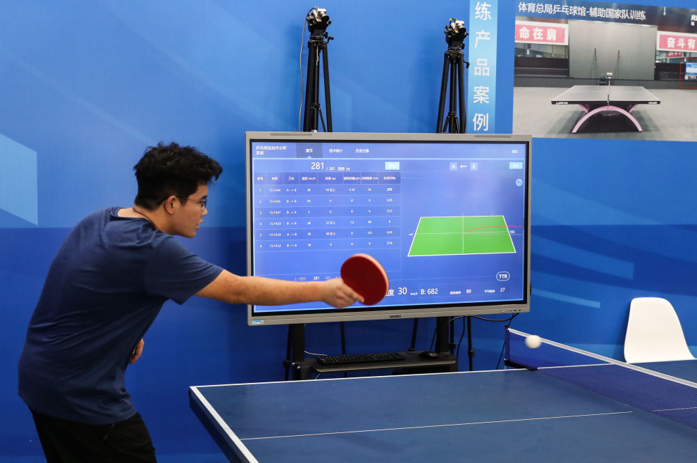 ↑ 這是9月10日在瑞蓋科技展區(qū)拍攝的乒乓球回放評(píng)審系統(tǒng)。