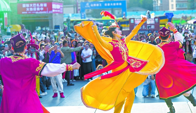 近日,游客在新疆國(guó)際大巴扎景區(qū)欣賞舞蹈。隨著秋季旅游旺季到來(lái),各地游客紛紛來(lái)到該景區(qū)拍照打卡,享受美好生活?! 鯇O振嵩攝