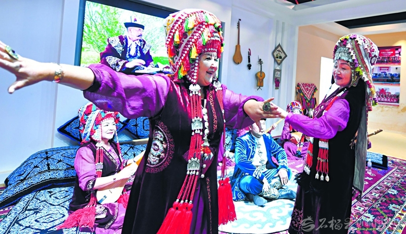 近日,在慶祝新疆維吾爾自治區(qū)成立70周年——克孜勒蘇柯?tīng)柨俗巫灾沃葜黝}成就展展廳內(nèi),阿圖什市民間藝人深情吟唱英雄史詩(shī)《瑪納斯》。圖為民間藝人在吟唱中起舞?!跏裨疲陆?qǐng)?bào)記者湯永攝