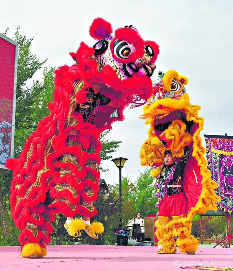 9月23日,為慶祝自治區(qū)成立70周年、歡慶“中國(guó)農(nóng)民豐收節(jié)”,和布克賽爾蒙古自治縣查和特鄉(xiāng)舉行了一系列活動(dòng)。圖為群眾進(jìn)行舞獅表演?!鹾纬袕?qiáng)攝