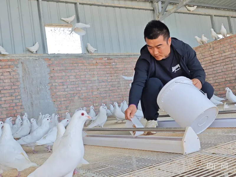 養(yǎng)殖戶正在喂養(yǎng)鴿子?。ㄑ霃V網(wǎng)發(fā) 七師胡楊河市融媒體中心供圖)
