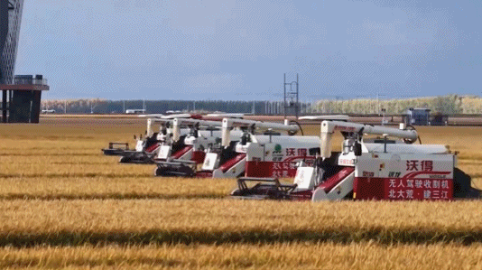 在黑龍江北大荒建三江七星農(nóng)場,無人機(jī)跟隨多臺無人駕駛收割機(jī),記錄正在進(jìn)行中的秋收大會戰(zhàn);在五常大米核心生產(chǎn)基地,穿越機(jī)飛越廣袤田野,稻穗編織成的“黃金毯”一覽無余,稻谷被整齊劃一地“吞”入農(nóng)機(jī)“口中”,開啟這個豐收季沉甸甸的收獲。