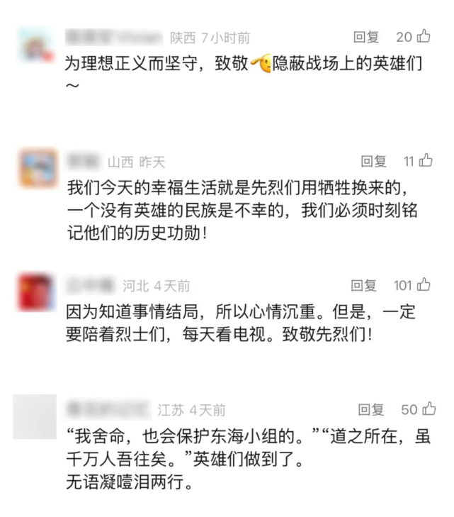 網(wǎng)友紛紛留言:“這是首部沒有懸念但仍然想要追下去的?。 薄耙?yàn)橹澜Y(jié)局,所以心情沉重,但一定要追下去,唯一的理由就是致敬先烈!”