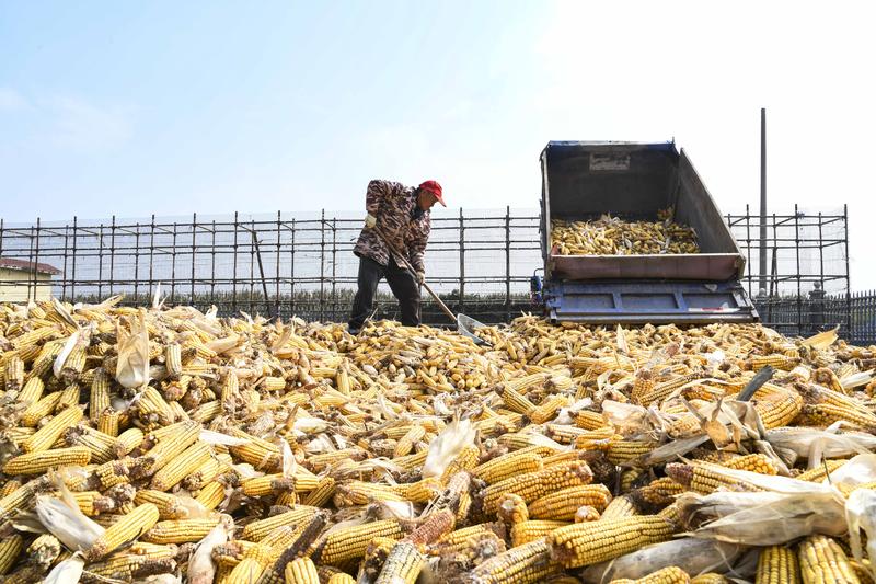 2025年10月14日,河南省濟(jì)源市五龍口鎮(zhèn)農(nóng)民晾曬剛收獲的玉米。新華社發(fā)(苗秋鬧攝)