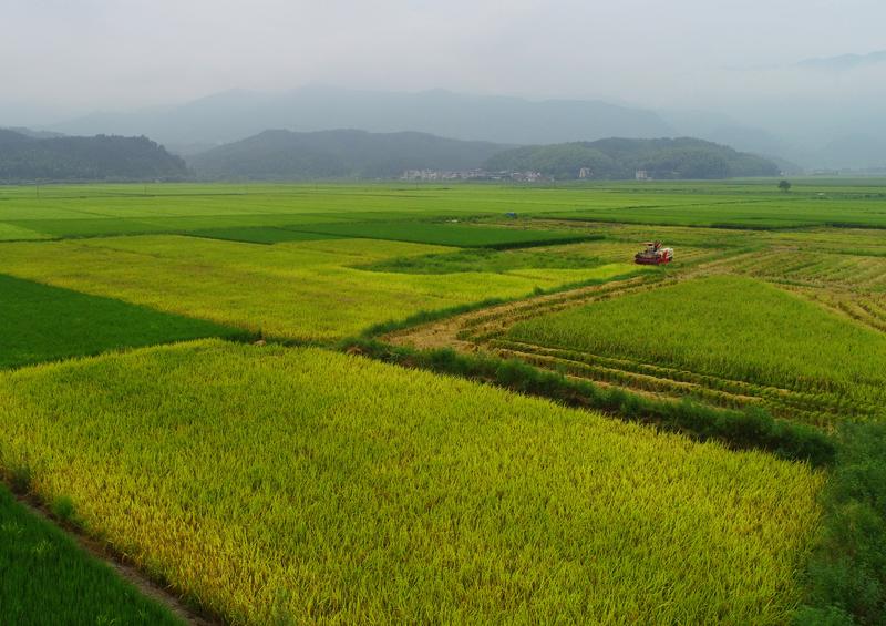 2025年8月31日,在福建省南平市浦城縣仙陽(yáng)鎮(zhèn),村民駕駛收割機(jī)在田間作業(yè)(無(wú)人機(jī)照片)。新華社發(fā)(黃杰敏攝)
