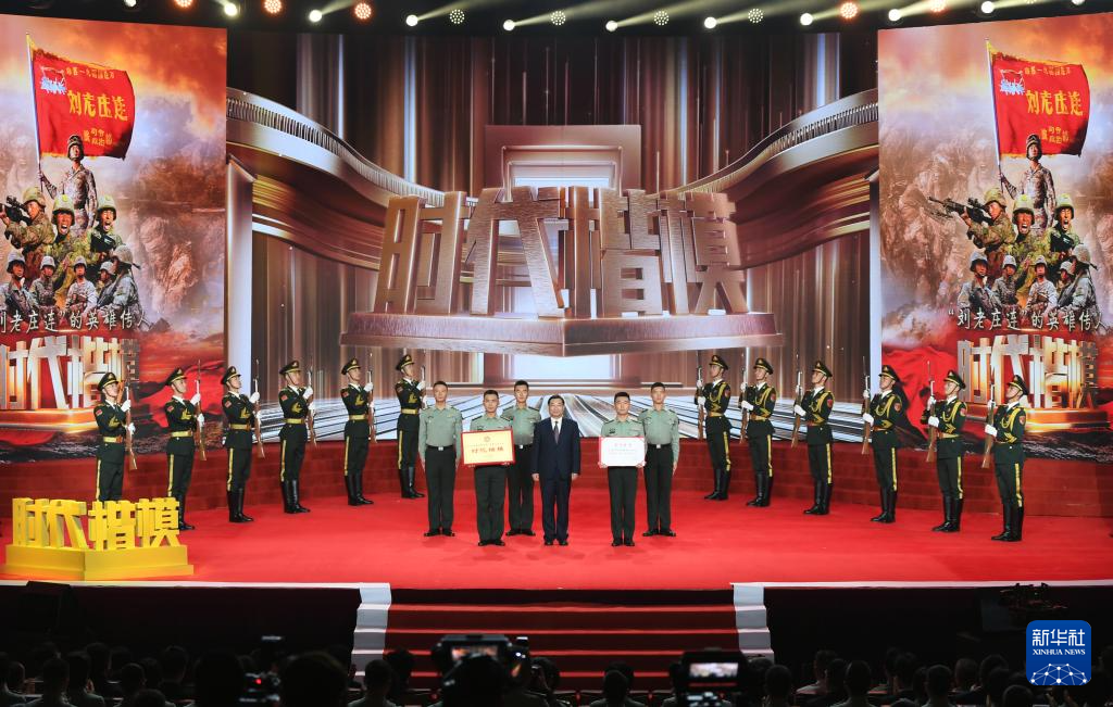 在“時(shí)代楷?!卑l(fā)布儀式上,陸軍某合成旅合成二營(yíng)裝甲步兵一連(“劉老莊連”)官兵代表領(lǐng)取“時(shí)代楷?!豹?jiǎng)牌和證書(9月29日攝)。新華社發(fā)(華夏 攝)