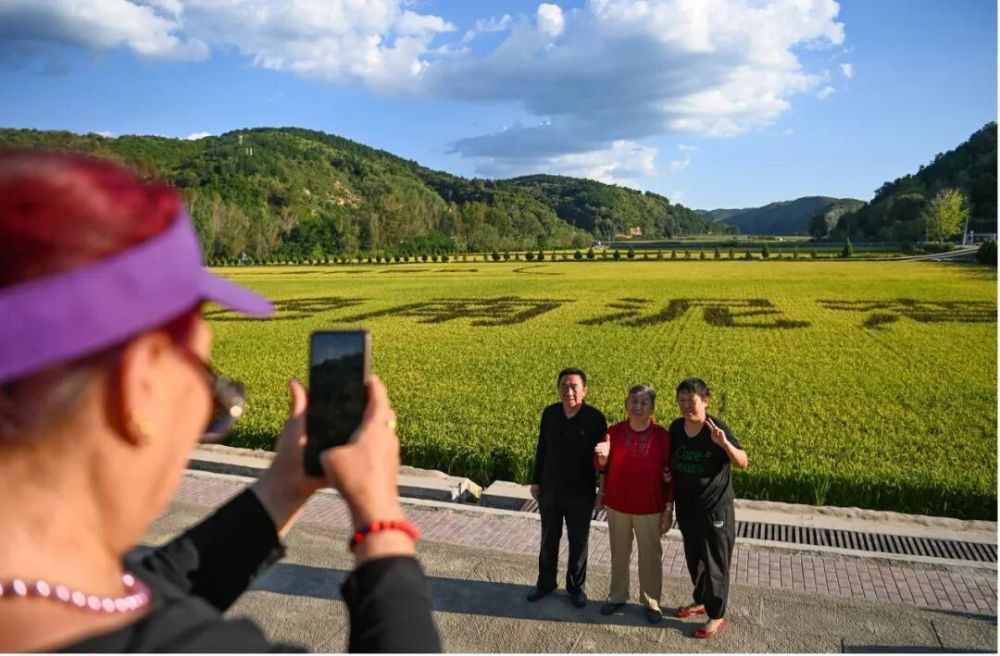 游客在南泥灣的稻田前留影。新華社記者 鄒競一 攝