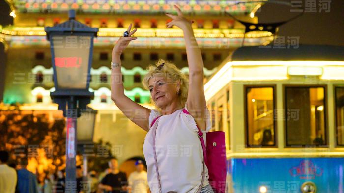 2025年9月10日,北京前門大街,外國游客感受古都夜韻。