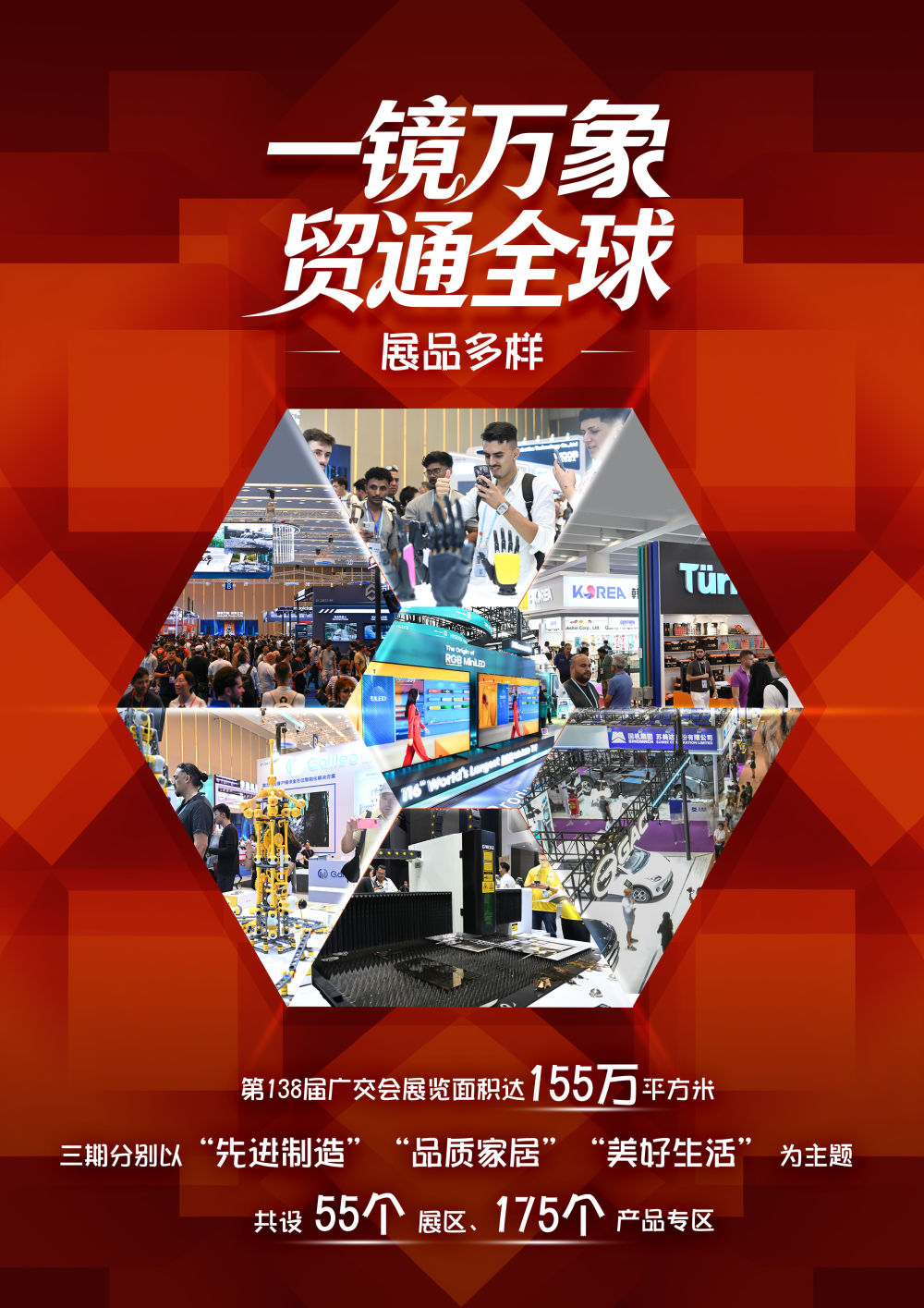第138屆廣交會于10月15日至11月4日分三期在廣州舉辦,本屆廣交會展覽面積達(dá)155萬平方米。展位總數(shù)7.46萬個,參展企業(yè)超3.2萬家,均創(chuàng)歷史新高,約3600家企業(yè)首次亮相。