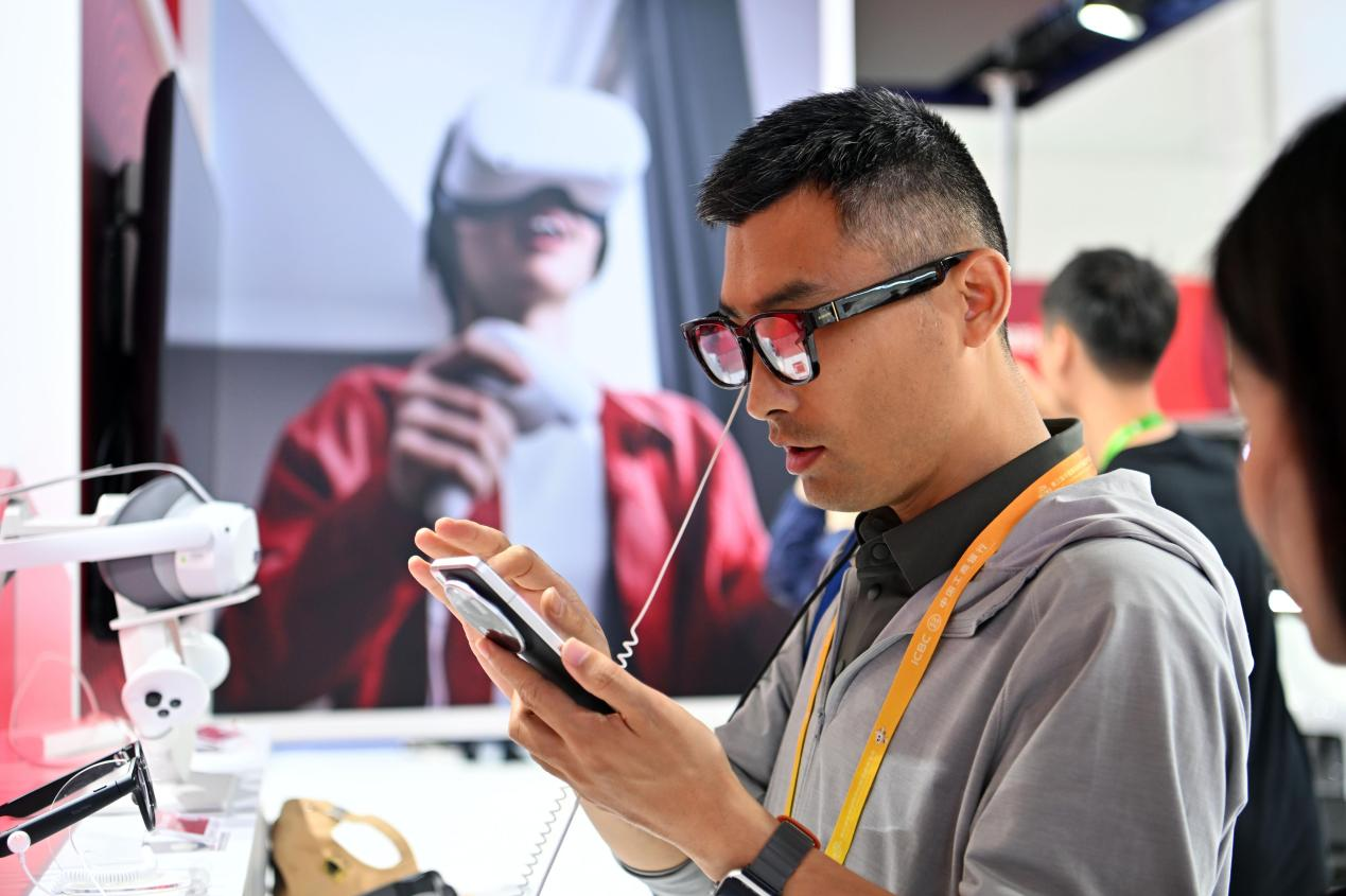 在第三屆中國國際供應(yīng)鏈促進(jìn)博覽會上,參觀者體驗(yàn)國產(chǎn)AI眼鏡。人民網(wǎng)記者 翁奇羽攝