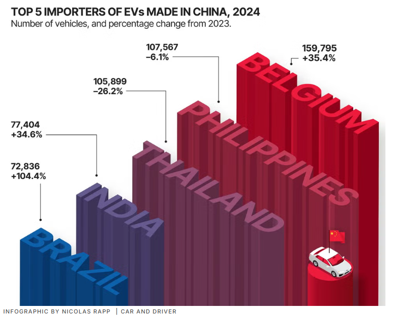 2024年中國(guó)制造電動(dòng)汽車(chē)的前五大出口國(guó),分別是比利時(shí)、菲律賓、泰國(guó)、印度和巴西。