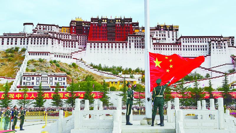 10月1日,西藏自治區(qū)慶祝中華人民共和國(guó)成立74周年“升國(guó)旗、唱國(guó)歌”儀式在布達(dá)拉宮廣場(chǎng)舉行。這是儀式現(xiàn)場(chǎng)。記者 旦增西旦 攝
