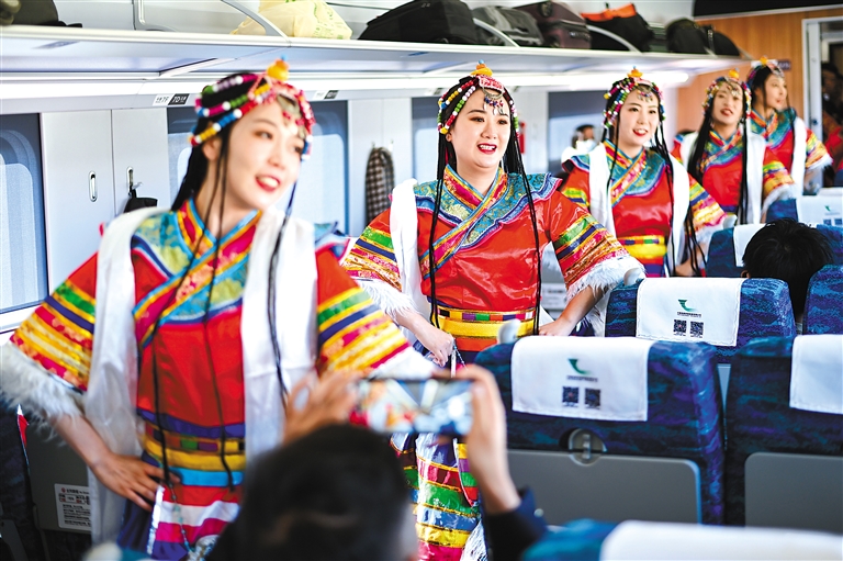 1月26日,中國鐵路青藏集團(tuán)有限公司西寧客運(yùn)段文藝小分隊(duì)在列車上為旅客表演。